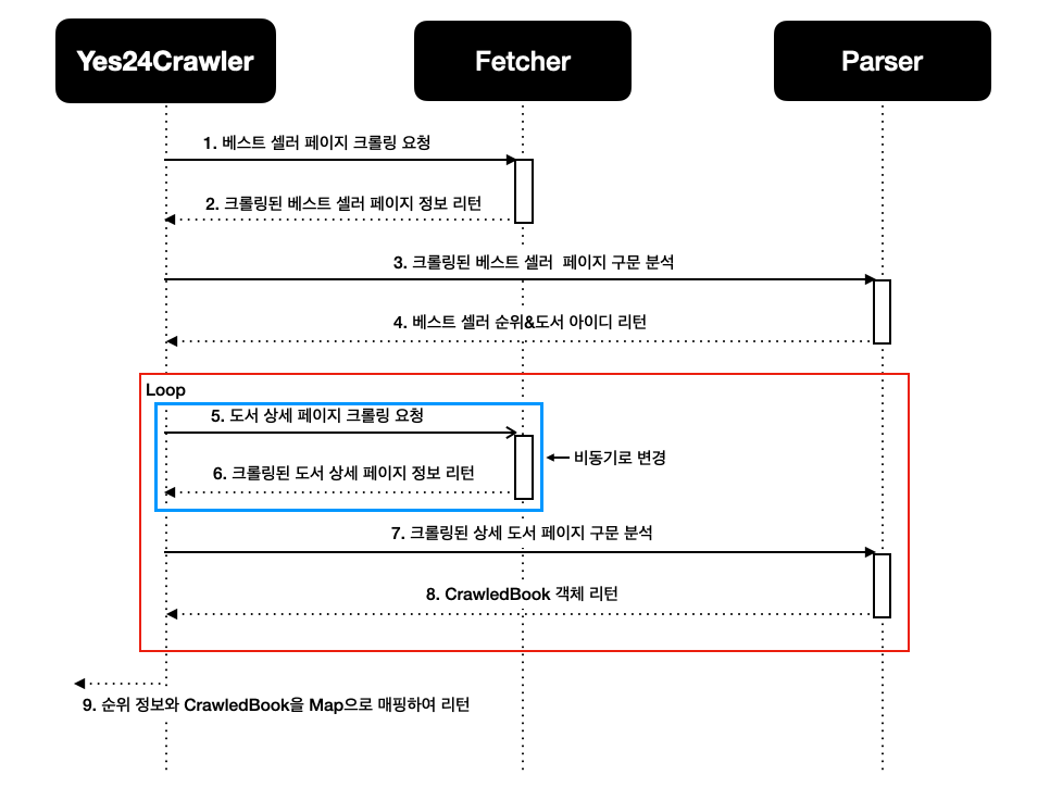 bestSellerIds์ ๊ฐ ํญ๋ชฉ์ ๋ํด CompletableFuture.supplyAsync(...)๋ฅผ ์ฌ์ฉํ์ฌ ๋น๋๊ธฐ ์์ ์ ์์ํฉ๋๋ค. ์ด ์์ ์ fetcher.fetchBook(...)์ ํตํด ํฌ๋กค๋งํ ์์ธ ๋์ ์ ๋ณด๋ฅผ ๊ฐ์ ธ์ค๊ณ , parser.parseBook(...)์ ํตํด ์ฑ ์ ๋ณด๋ฅผ ํ์ฑํฉ๋๋ค.
