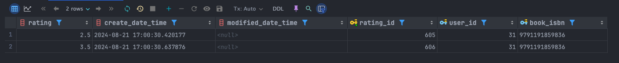 // ์กฐํํ user์ book์ ํตํด์ rating์ ์ค๋ณต ์์ฑํ๋์ง ํ์ธํ๋ค.